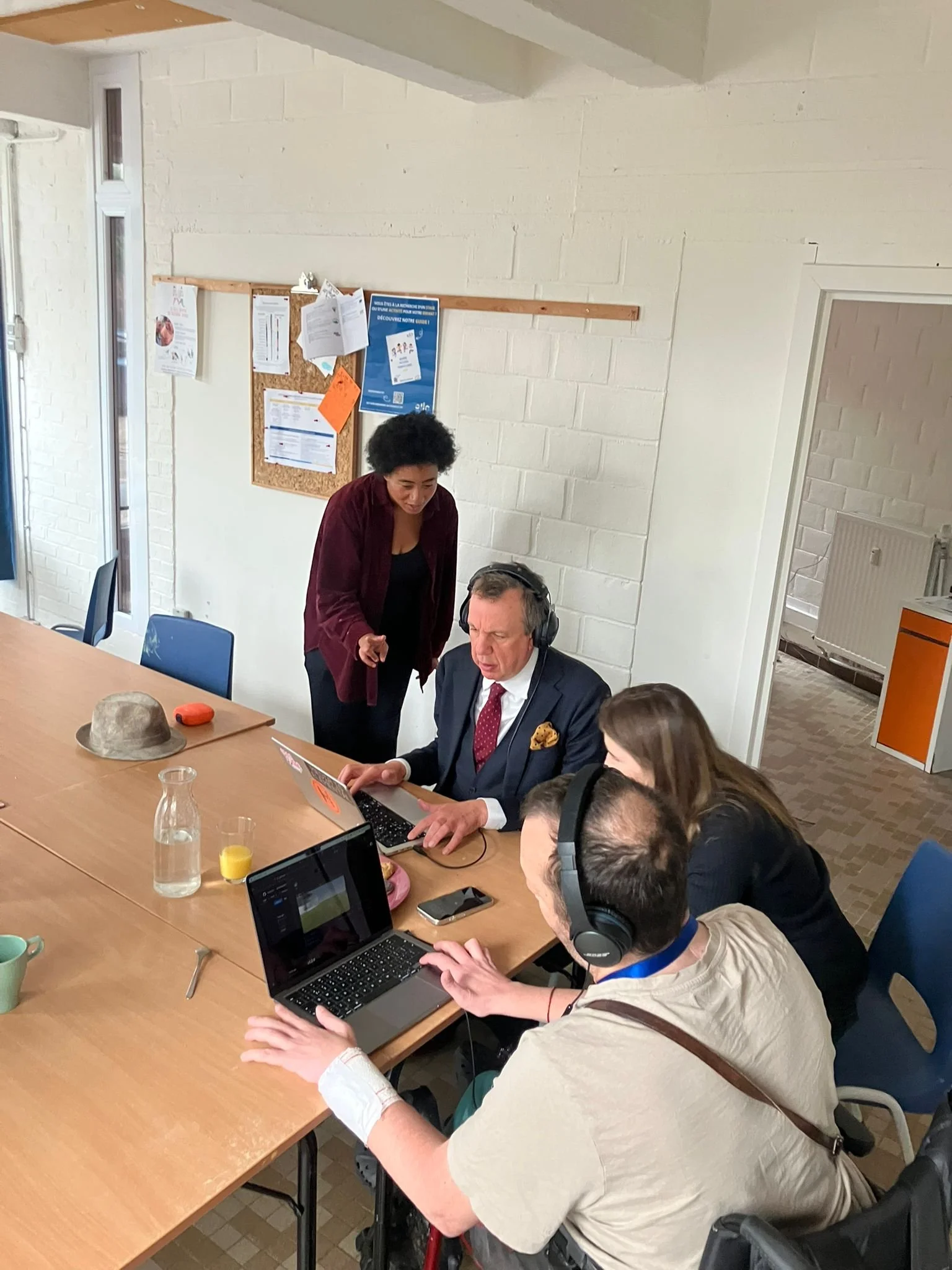 A small co-creation/work session in a bright room. Three participants wearing headphones work on laptops at a long table while another person stands and points, offering guidance. Mugs, a water carafe, and notes on a corkboard set an informal, collaborative atmosphere.