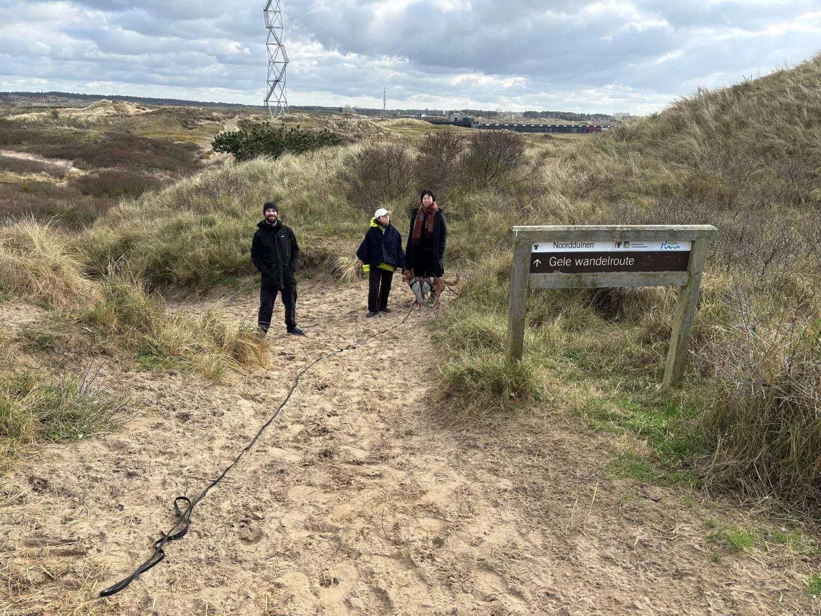 A sandy trail winds through coastal dunes under a cloudy sky. Three people stand near a wooden signpost that reads “Noordduinen – Gele wandelroute” with an arrow; one person holds a small dog on a leash. Tall grasses cover the rolling dunes, and a metal transmission tower rises in the distance. A long strap or lead lies on the sand in the foreground, adding to the casual, mid-hike feel of the scene.